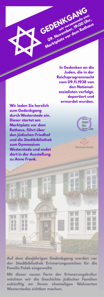 Jedes Jahr am 9. November gestalten Jugendliche aus Westerstede den Gedenkgang zur Erinnerung an die Reichspogromnacht von 1938. An diesem Tag wird der Opfer der nationalsozialistischen Gewalt gedacht – und zugleich ein Zeichen gesetzt für Zivilcourage, Menschlichkeit und den Einsatz gegen Antisemitismus und Ausgrenzung.