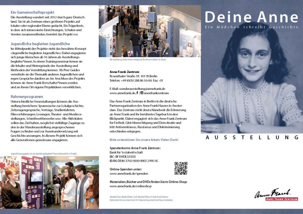 Vom 03. November bis zum 03. Dezember 2025 ist in der Aula der Europaschule Gymnasium Westerstede die Wanderausstellung „Deine Anne. Ein Mädchen schreibt Geschichte“ des Anne Frank Zentrums Berlin zu sehen.